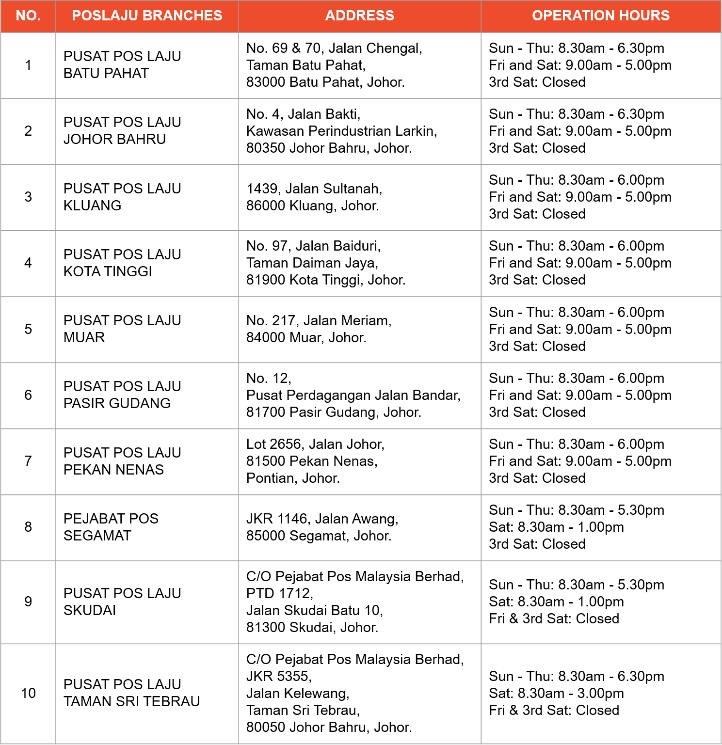 Poslaju Pekan Nenas Johor 60 7 699 1662 from lh3.googleusercontent.com 14 apr 2017 by dragon. Pos laju pekan nenas lot 2656 jalan johor 81500 pekan nenas,pontian pontian, johor tel : Posting hour & window collection hour: 29, jalan industri 9, taman perindustrian pekan nanas, 81500 pekan nanas, johor. Pos laju pekan nenas (johor) address:lot 2656 jalan johor 81500 pekan nenas,pontian pontian, johor opening hours: 09 jul 2019 11:18 am. 113m syahrulzaman enterprise (joker) 114m zidtrade (m) sdn bhd 115m restoran su tomyam. No 97 jalan baiduri taman daiman jaya 81900 kota tinggi, johor.